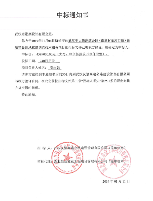 2019年1月11日,中國招投標(biāo)公共服務(wù)平臺(tái)發(fā)布公告,我司成功中標(biāo)武漢至大悟高速公路(南湖村至河口段)新增建設(shè)用地權(quán)屬調(diào)查技術(shù)服務(wù)項(xiàng)目,中標(biāo)價(jià)格為459.9萬元,該項(xiàng)目建設(shè)單位為武漢漢悟高速公路建設(shè)管理有限公司。